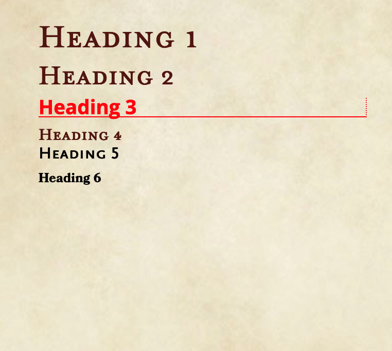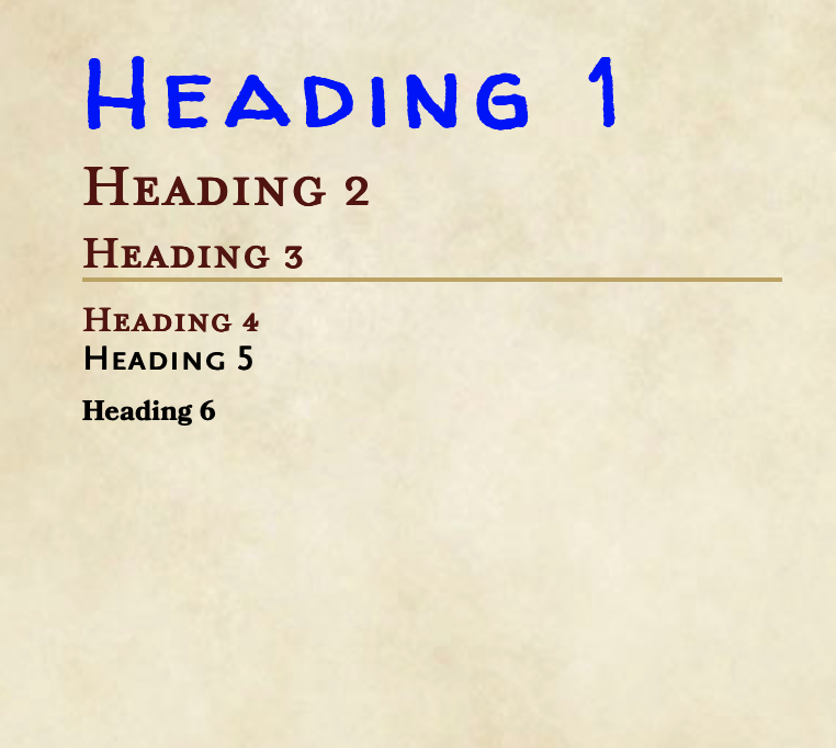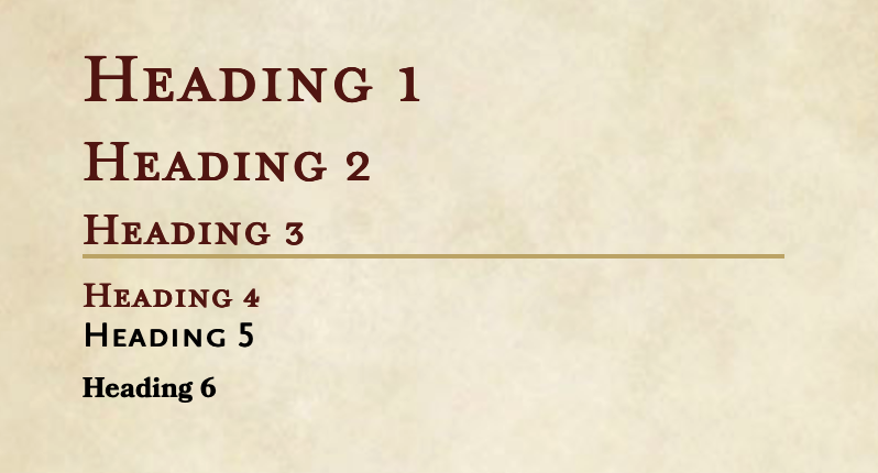 In the default 5th Edition PHB theme, you can see that the styling of each header level is different, generally decreasing in size and visual impact as you get to higher levels. This is just a stylistic difference, and can be changed with CSS in the Style Editor. Generally, you want to avoid using a particular level of header based solely on it’s appearance/size, particularly if you are sharing a brew via a Homebrewery link or PDF. Using inappropriate headers impacts accessibility for screen readers, and can impact other things, such as how PDF readers generate their document outlines.